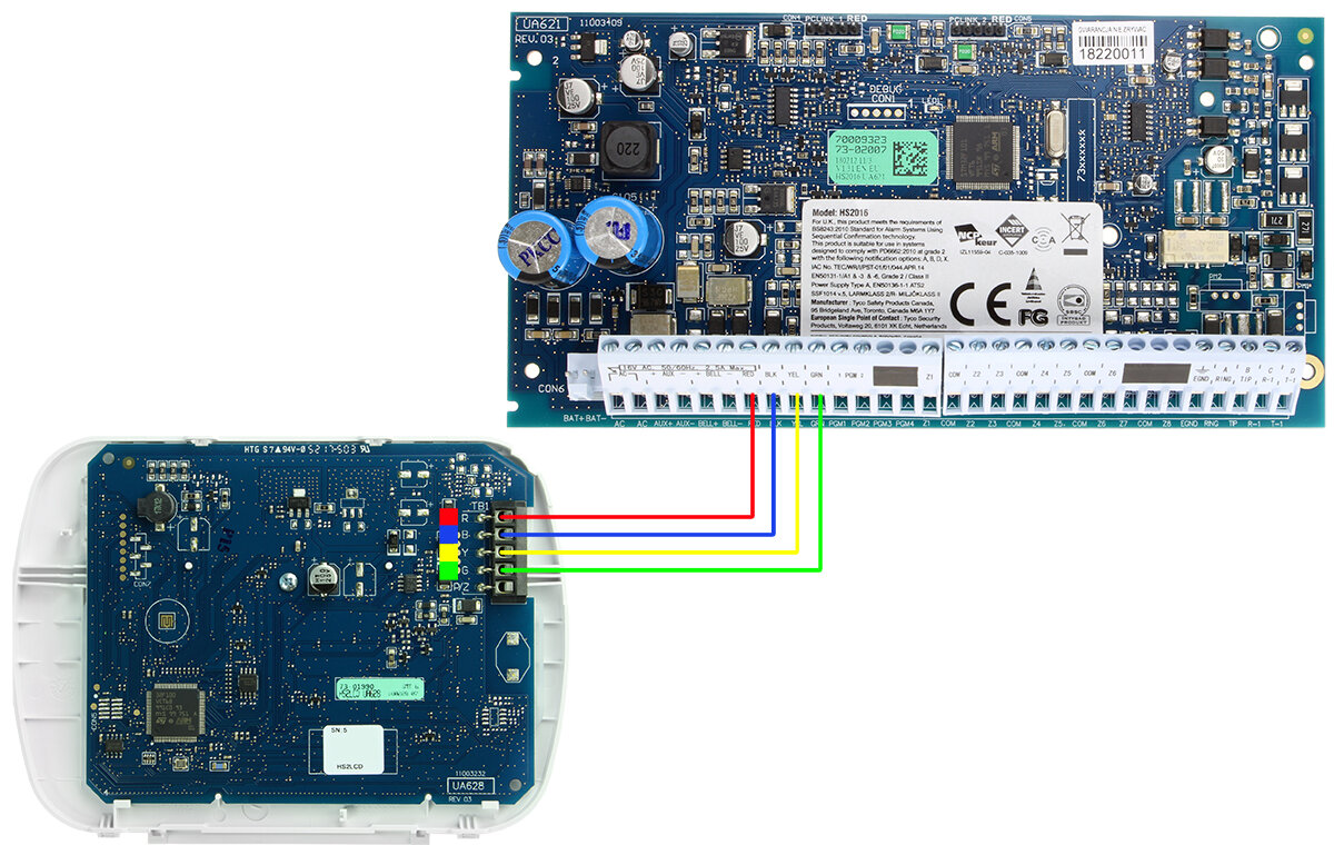 Schéma připojení klávesnice DSC HS2LCD, HS2LEDE1 k hlavní desce DSC HS2016, HS2032, HS2064