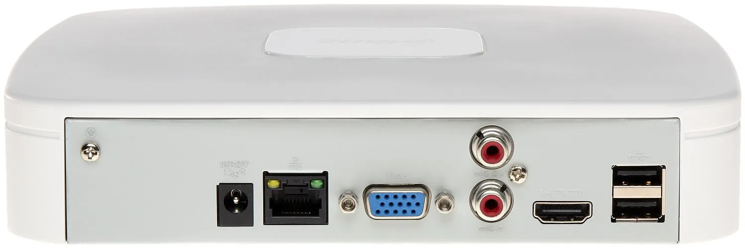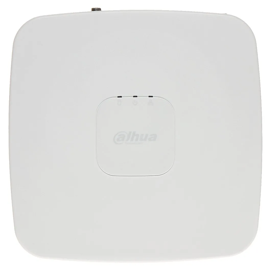 Biały rejestrator IP Dahua NVR2108-4KS3 z zaokrąglonymi krawędziami i logo na górze. Urządzenie posiada otwory wentylacyjne po bokach.