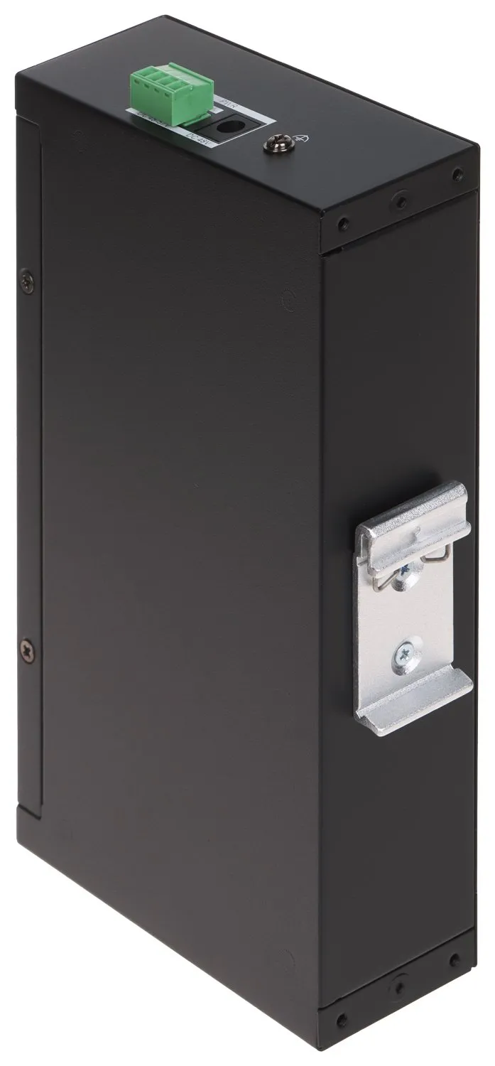 Czarny metalowy moduł z widocznymi złączami zasilania i etykietą informacyjną na górze. Na przednim panelu znajdują się zielone złącze śrubowe oraz gniazdo zasilania DC.