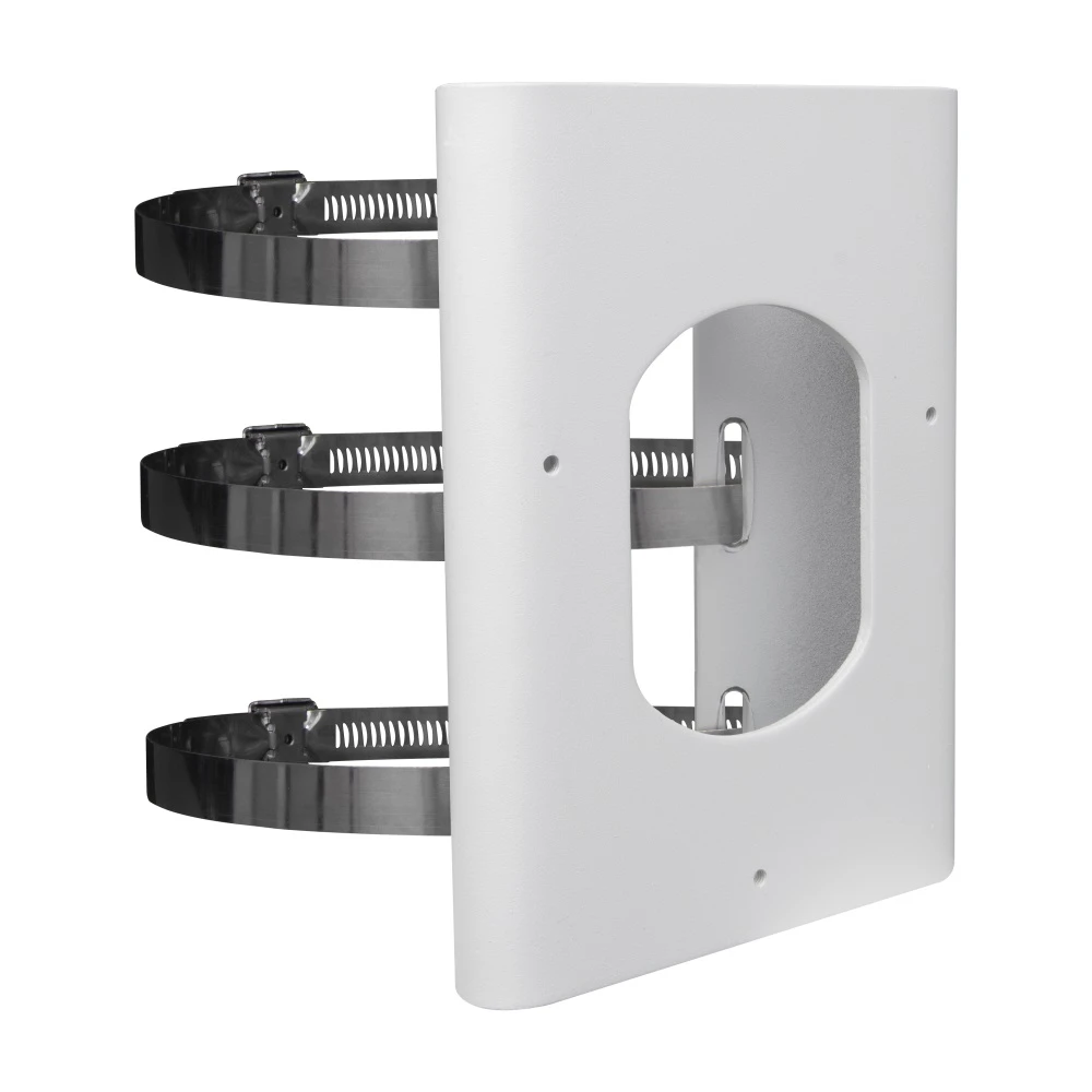 Uchwyt słupowy do kamer w kolorze białym z trzema metalowymi opaskami zaciskowymi. Konstrukcja umożliwia montaż na słupach, zapewniając stabilne mocowanie kamer.