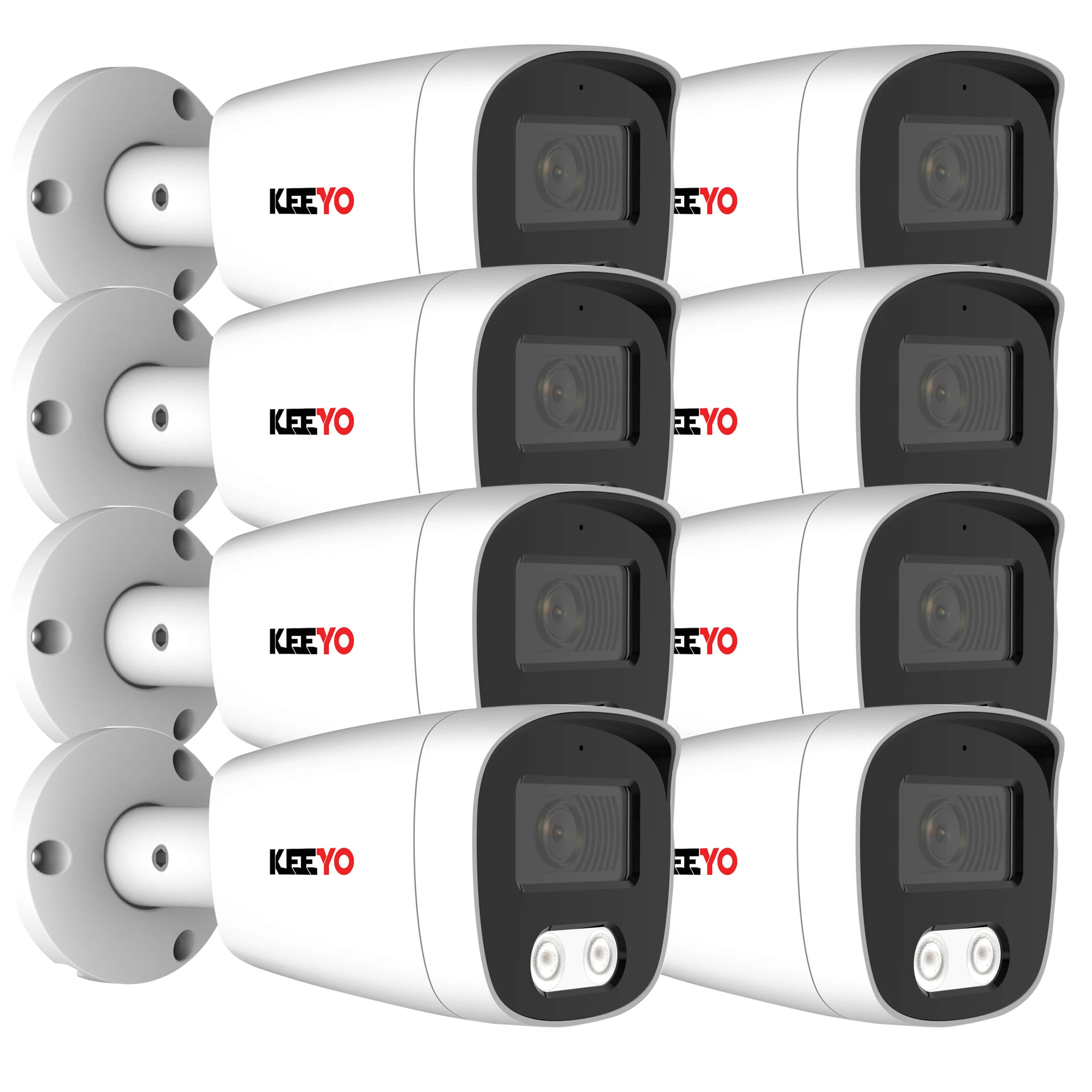 Na zdjęciu znajduje się zestaw ośmiu białych kamer tubowych z czarnymi frontami, ułożonych w dwóch rzędach. Kamery mają logo "KEEYO" i są przeznaczone do montażu na ścianie.