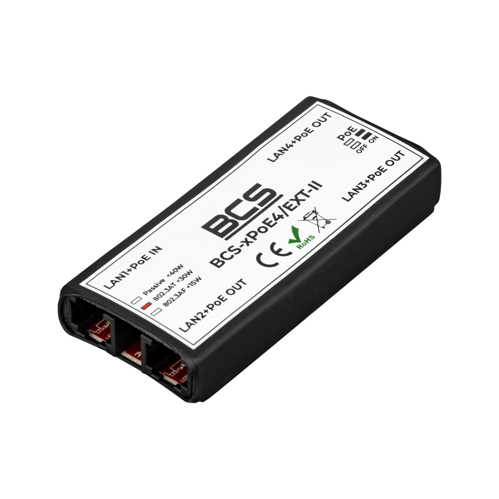 BCS-xPoE4/EXT-II - Nespravovaný síťový přepínač PoE, určený pro IP dohledový systém. Je přizpůsoben pro práci s jakýmkoli přepínačem PoE (802.3af / 802.3at) a umožňuje rozšířit systém o 3 další IP kamery. Přepínač navíc zvyšuje efektivní dosah přenosu (aktivní regenerace signálu), což umožňuje realizovat rozsáhlý distribuovaný systém s jedním centrálním zdrojem napájení.